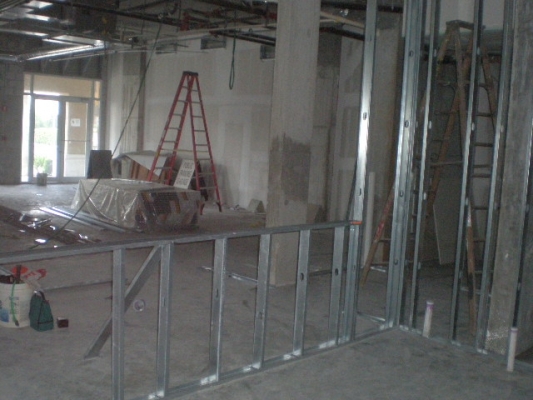 The Light-gage stud partitions are installed. Ready for inwall pipes and conduits, prior to sheet rock (gypsum panel) installation
